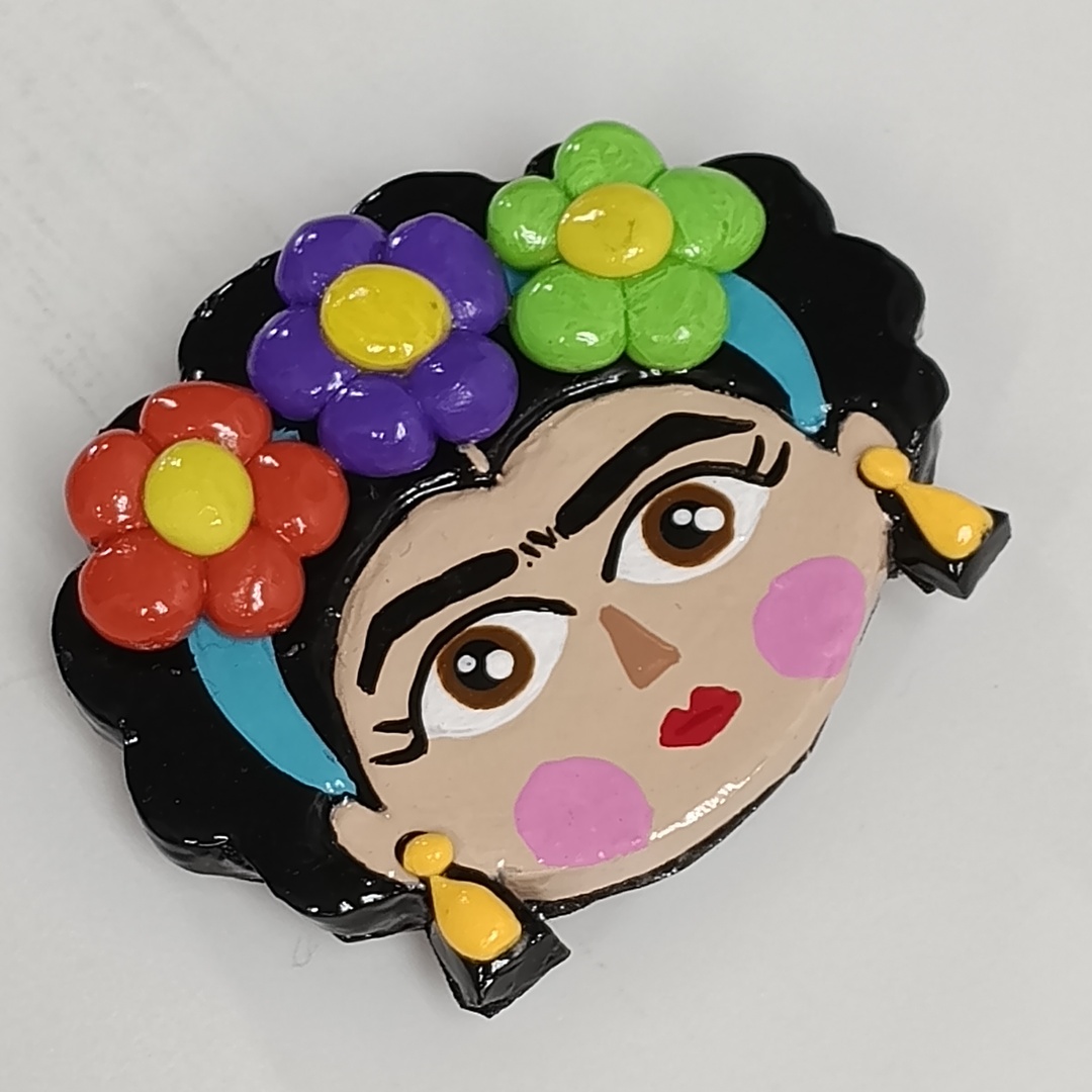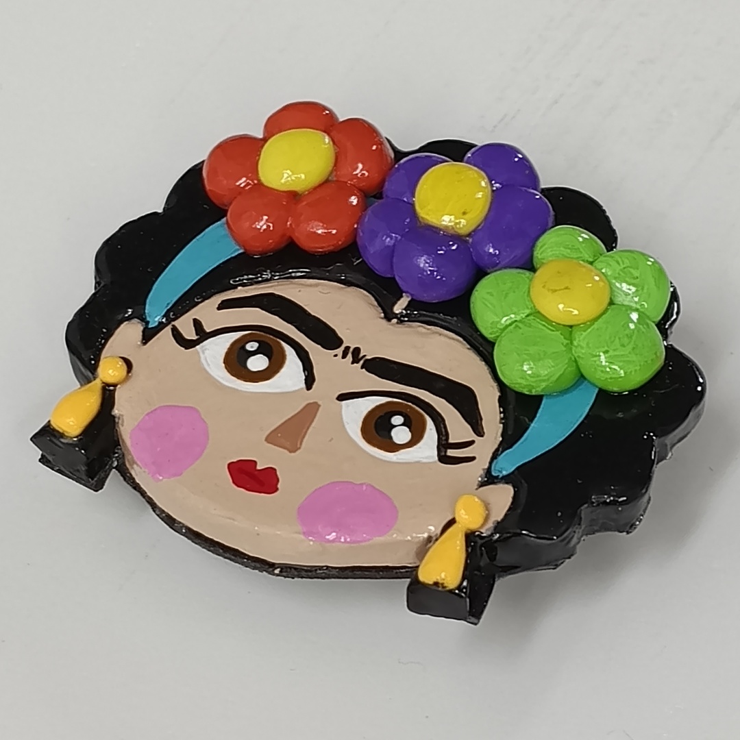 El diseño está inspirado en la icónica figura de Frida Kahlo, símbolo de creatividad, fuerza y libertad artística. Esta reinterpretación aporta un estilo alegre y contemporáneo, manteniendo elementos reconocibles como las flores, los colores intensos y la expresividad del rostro, convertidos en un broche lleno de energía y personalidad.