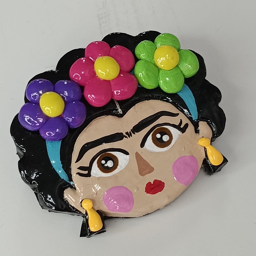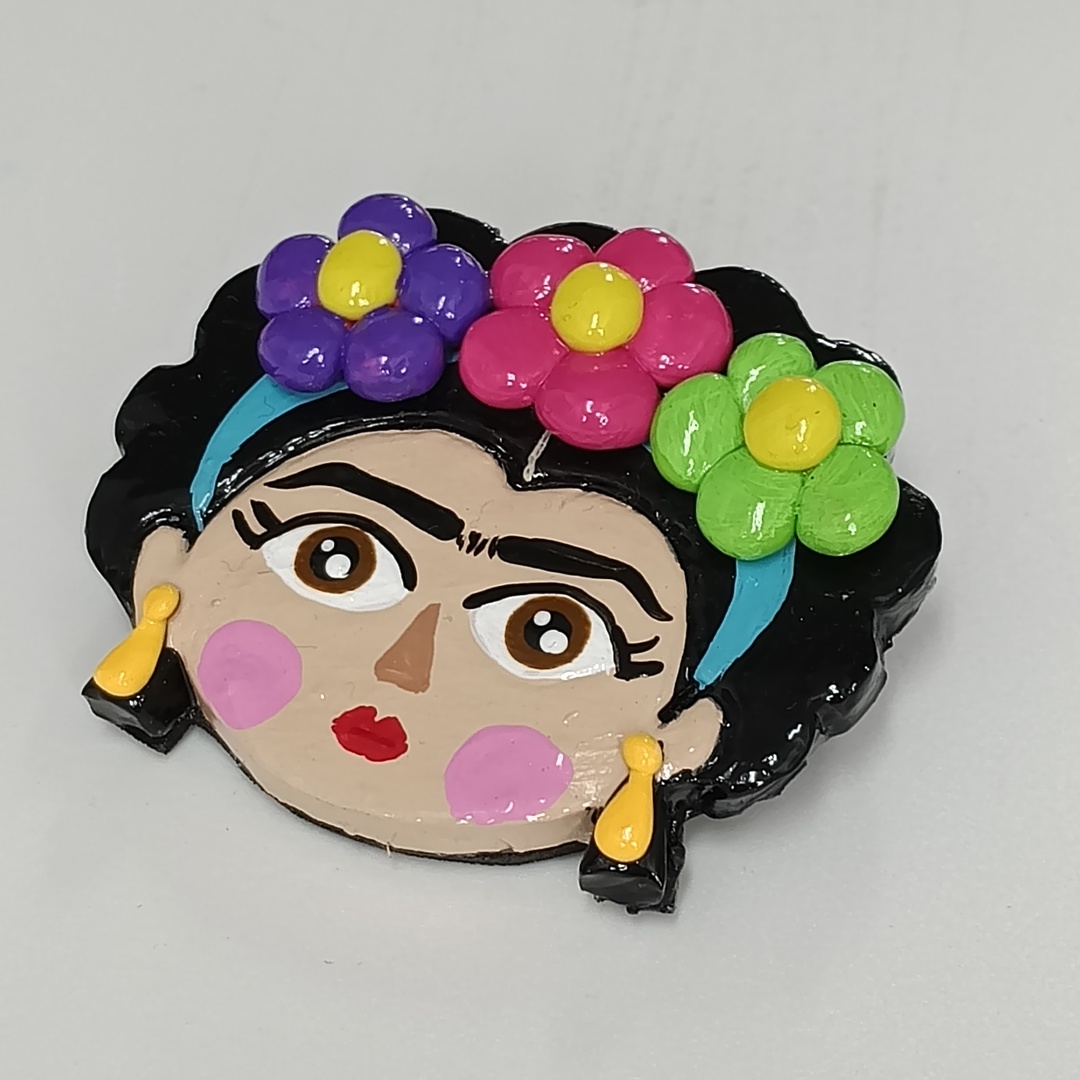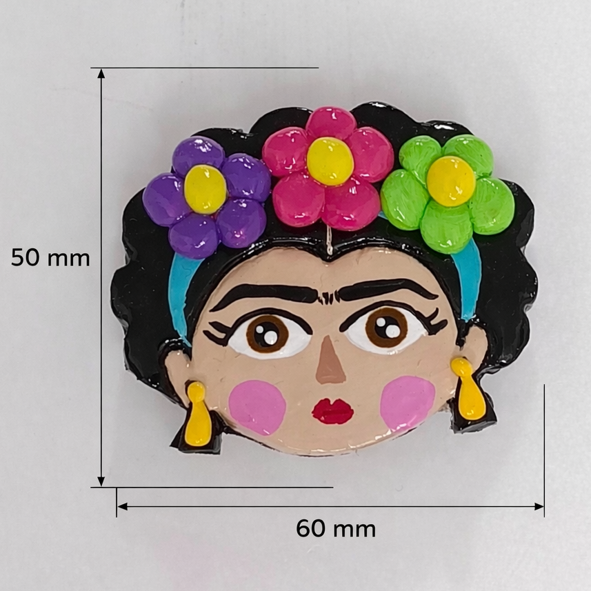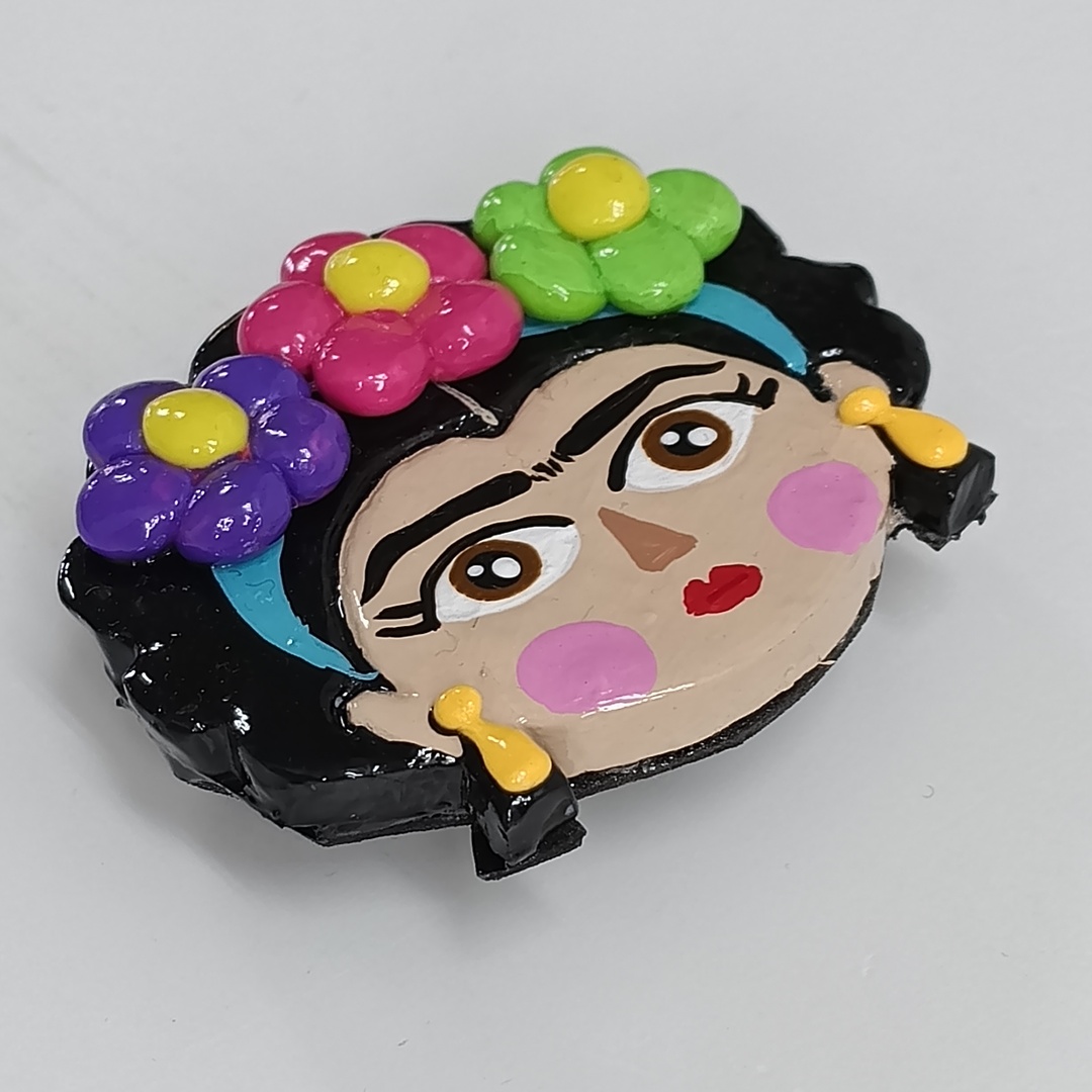 El diseño está inspirado en la icónica figura de Frida Kahlo, símbolo de creatividad, fuerza y libertad artística. Esta reinterpretación aporta un estilo alegre y contemporáneo, manteniendo elementos reconocibles como las flores, los colores intensos y la expresividad del rostro, convertidos en un broche lleno de energía y personalidad.