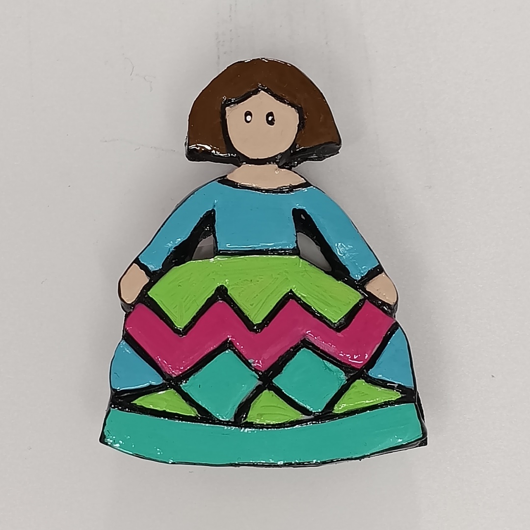 Broche artesanal de menina colorida, hecho con arcilla polimérica y pintado a mano, con acabado brillante y cierre de seguridad.