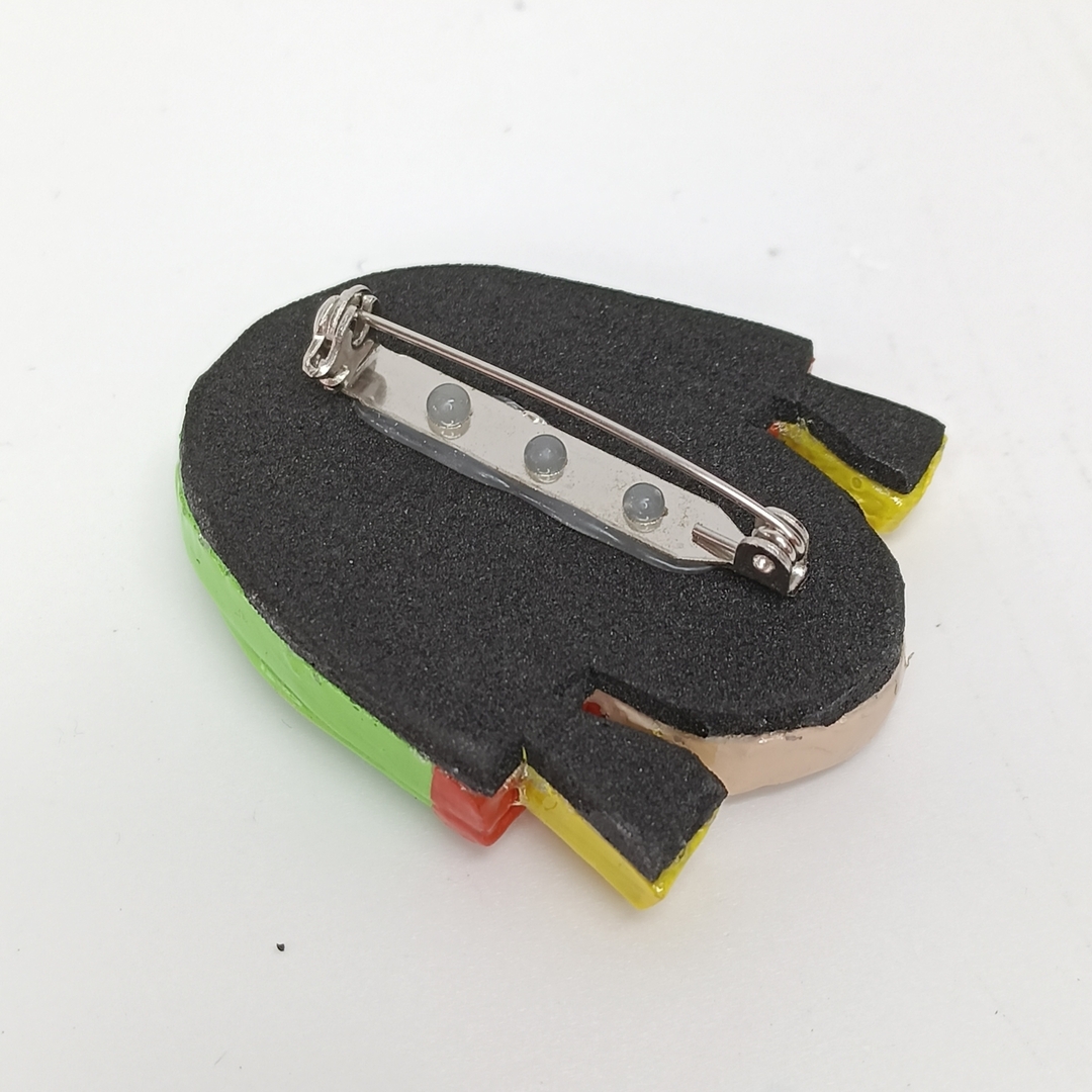 Broche artesanal de peliqueiro gallego hecho en arcilla polimérica y pintado a mano con acabado brillante y cierre de seguridad.