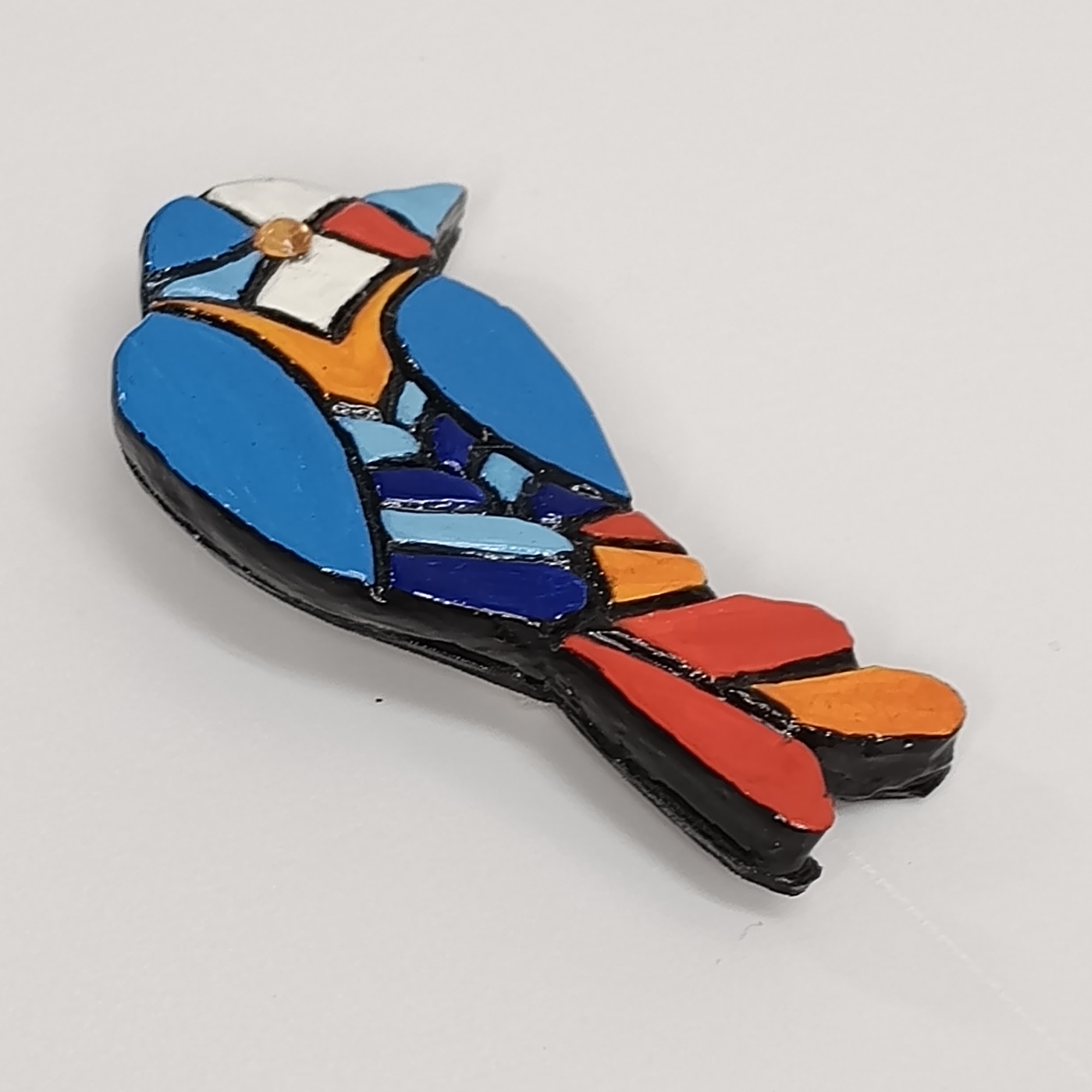 Este broche artesanal de la colección Pájaros a Todo Color está elaborado con arcilla polimérica y pintado cuidadosamente a mano, dando forma a un diseño lleno de vida y personalidad. Su estilo de falso mosaico combina colores intensos que crean un efecto visual alegre y muy llamativo, perfecto para quienes aman los complementos originales.
