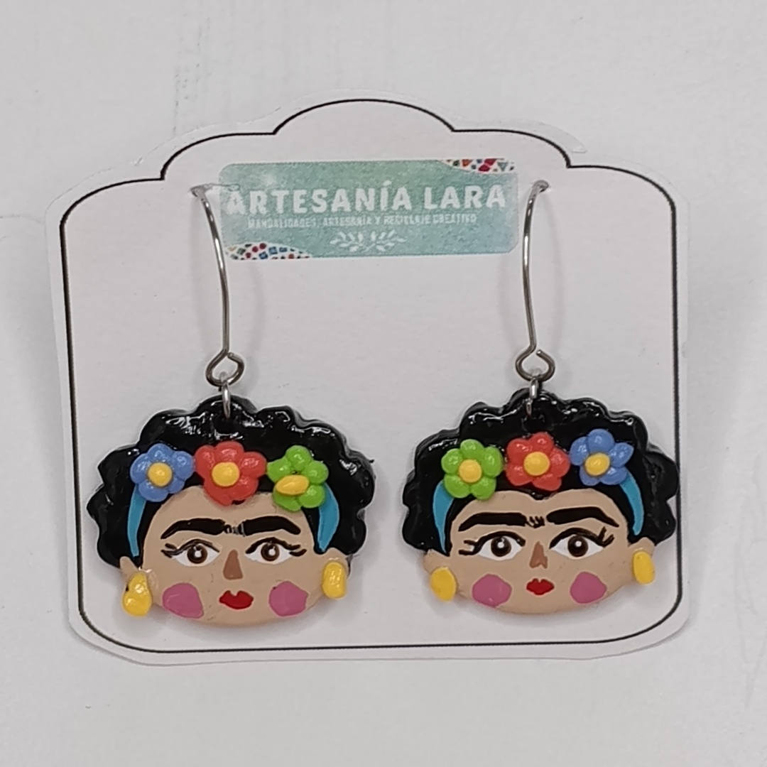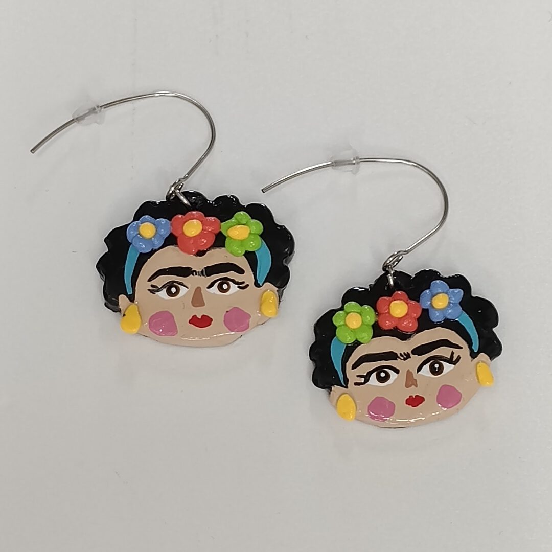 Pendientes artesanales inspirados en Frida Kahlo, hechos a mano con arcilla polimérica, pintados a mano, con acabado brillante y ganchos de acero inoxidable hipoalergénicos.
