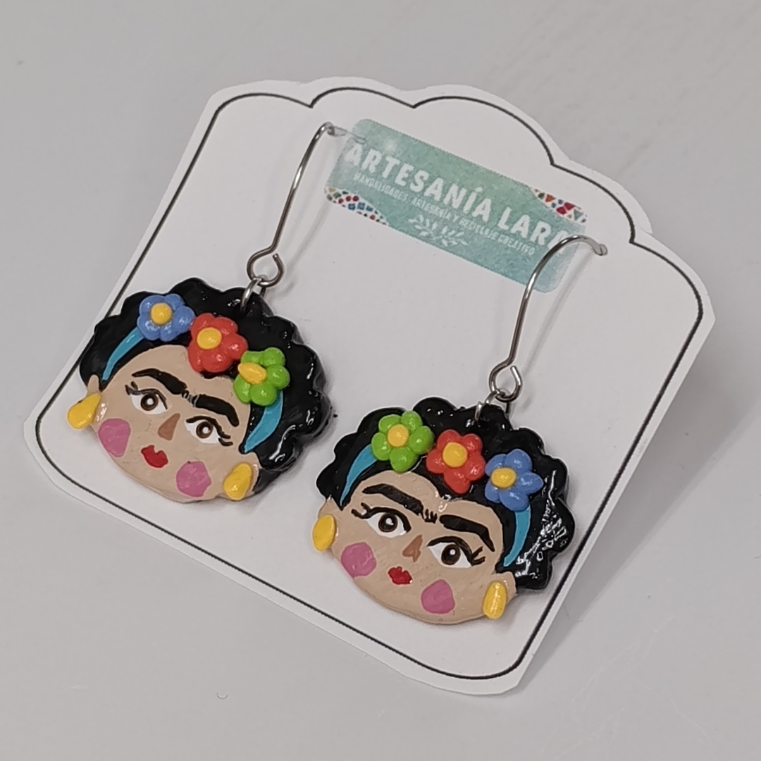 El diseño está inspirado en la icónica figura de Frida Kahlo, símbolo de creatividad, fuerza y libertad artística. Estos pendientes reinterpretan su imagen de una forma alegre y contemporánea, incorporando elementos característicos como las flores, los colores vivos y la expresividad del rostro, convertidos en un complemento lleno de carácter y energía.