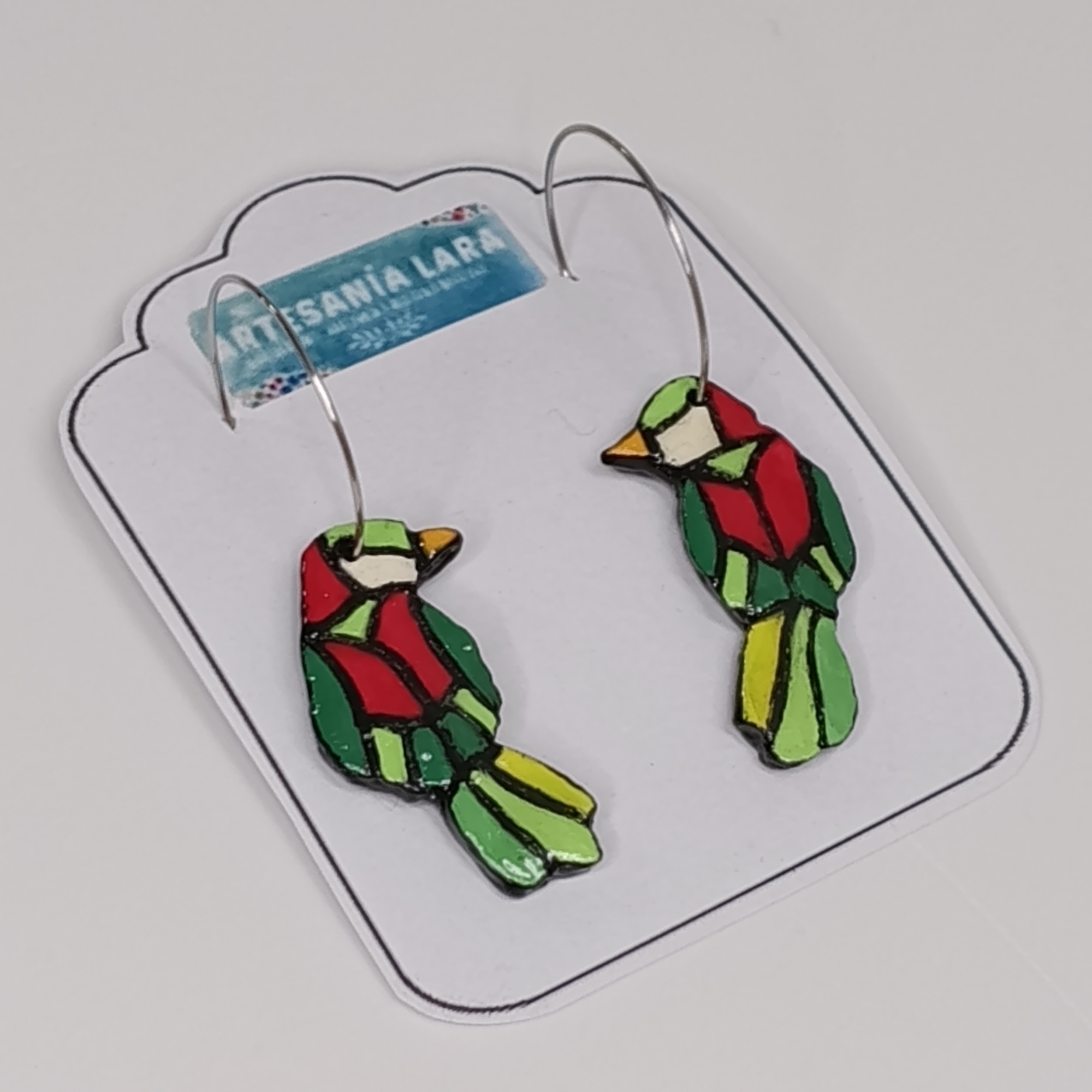 Pendientes artesanales de la colección Pájaros a Todo Color, con diseño de falso mosaico, hechos con arcilla polimérica, pintados a mano y acabado brillante.