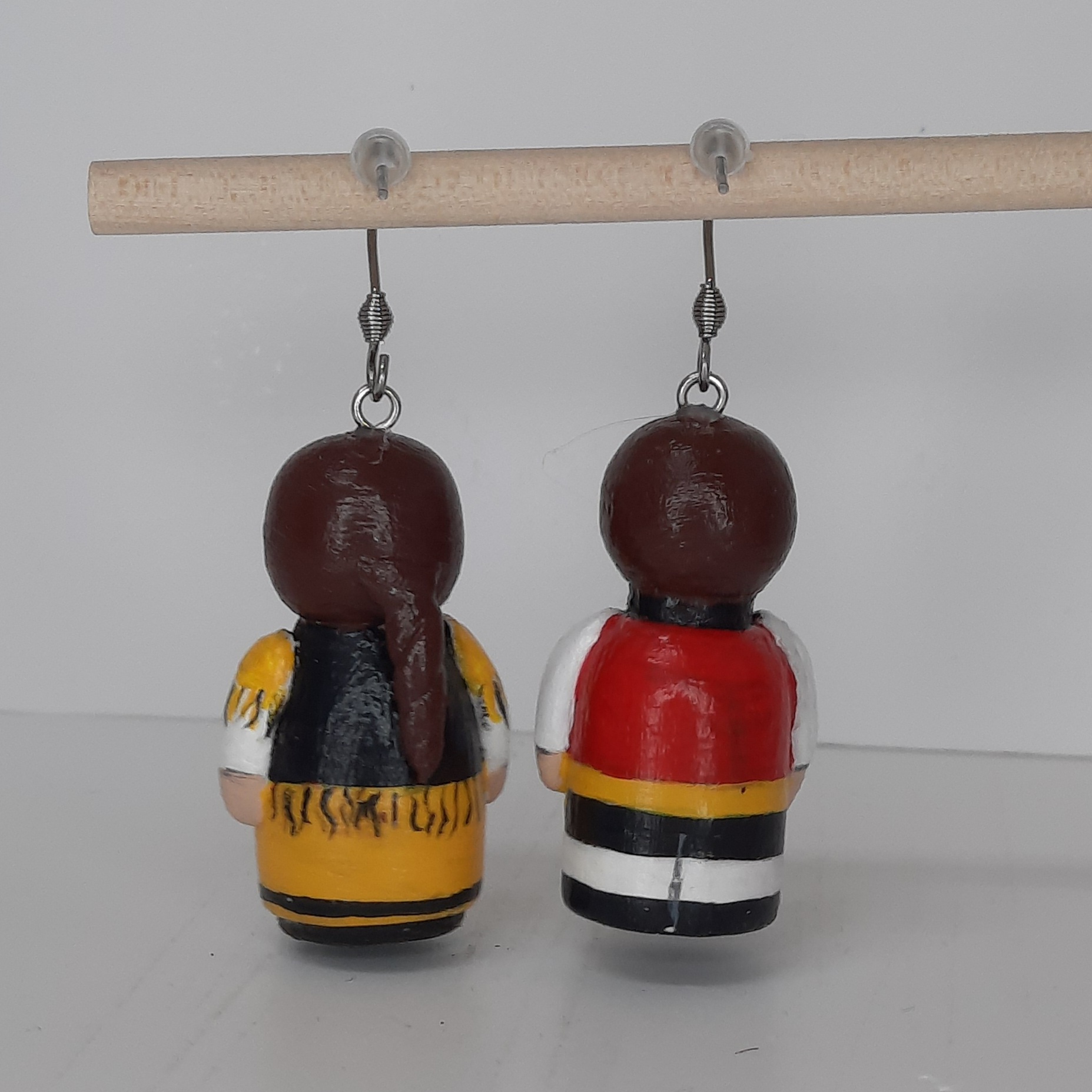 Pendientes de muñecos de madera, con detalles en arcilla y pintados a mano. Personalizables y con diseño original ideal para forofos del fútbol.