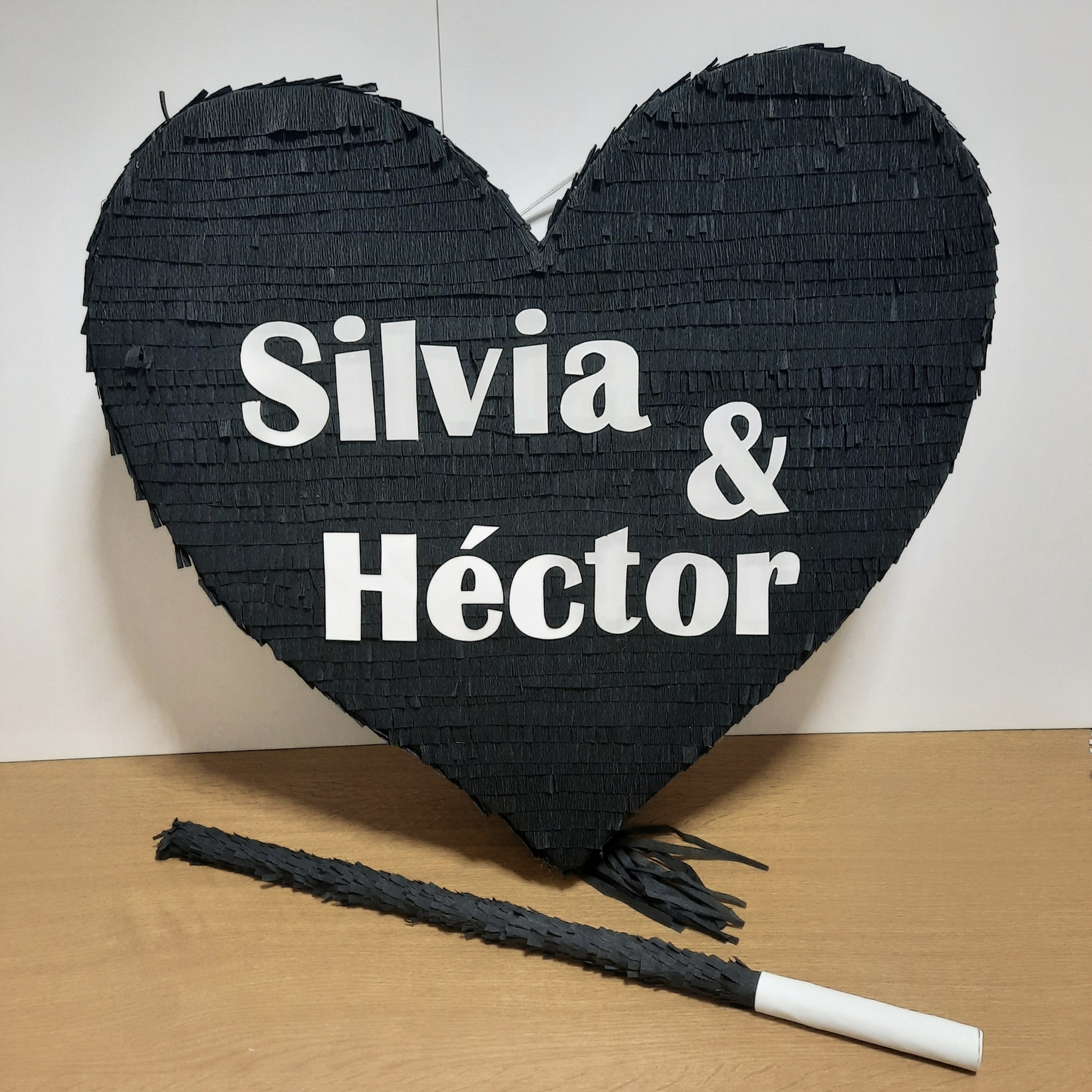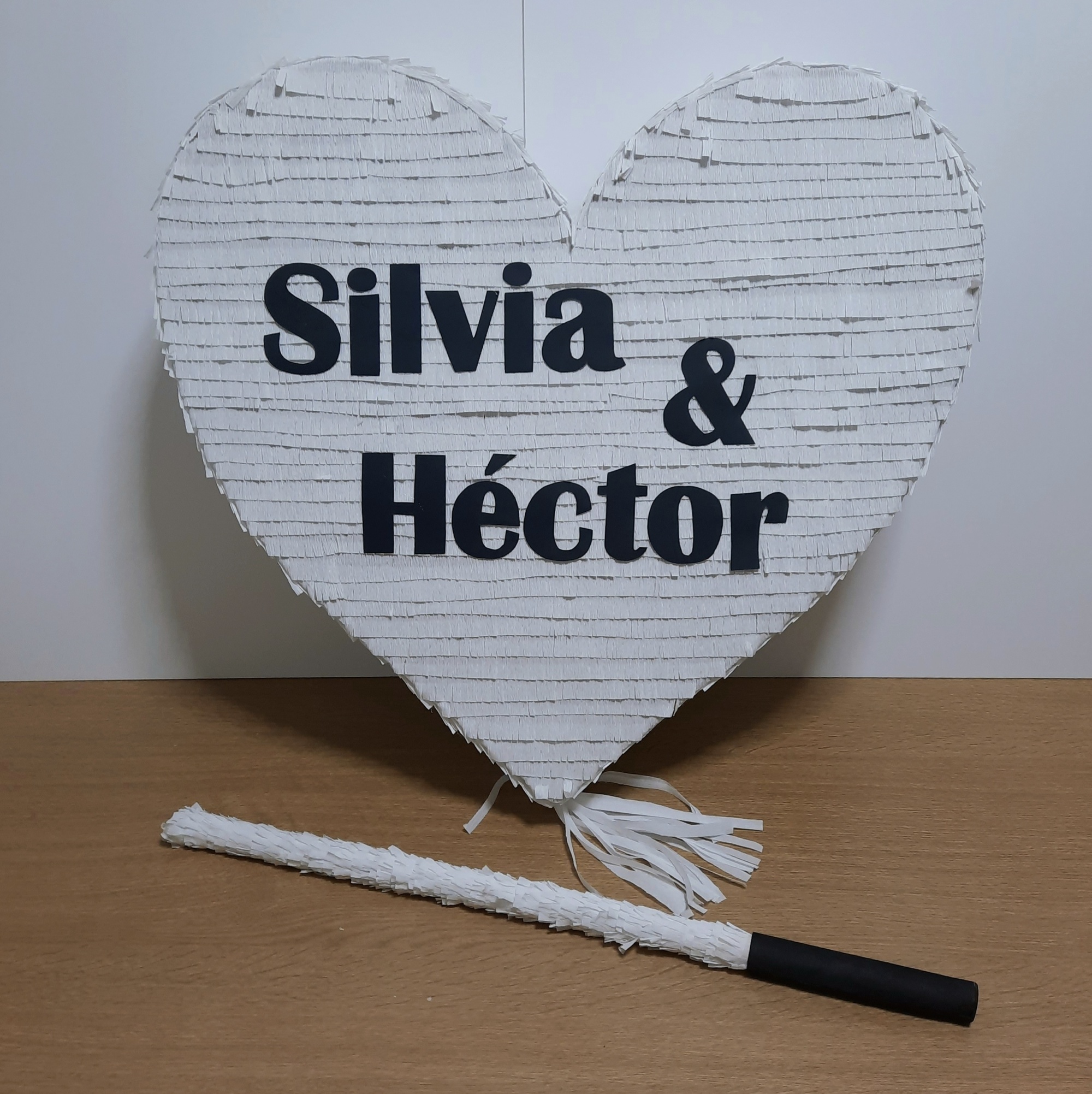 Pack de dos piñatas de corazón (más dos palos) personalizadas para boda, diseñadas para que los novios las abran a golpes con el palo, creando un momento divertido, participativo e inolvidable que sorprenderá a todos los invitados.
